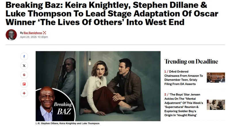 Il West End si prepara a uno degli eventi teatrali più attesi della prossima stagione: il ritorno di "Le vite degli altri", il film premio Oscar del 2007 che ha segnato la storia del cinema europeo.