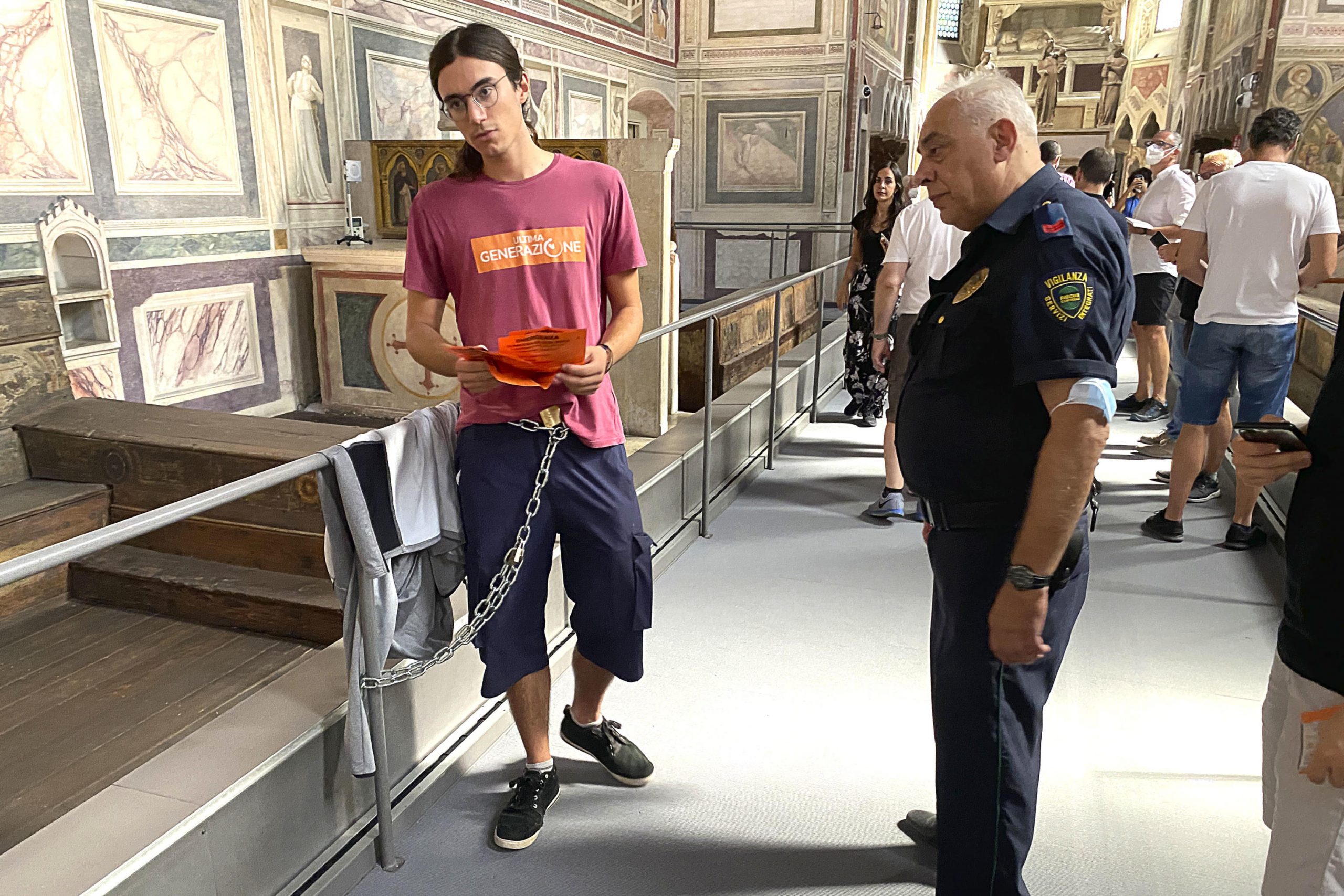 Stamattina a Padova quattro attivisti di Ultima Generazione sono entrati nella Cappella degli Scrovegni, incatenandosi alle balaustre che delimitano il percorso dei visitatori al ciclo di affreschi di Giotto. A quel punto, uno di loro ha letto ad alta voce i messaggi di protesta del movimento, contro lo spreco di acqua ed energia.