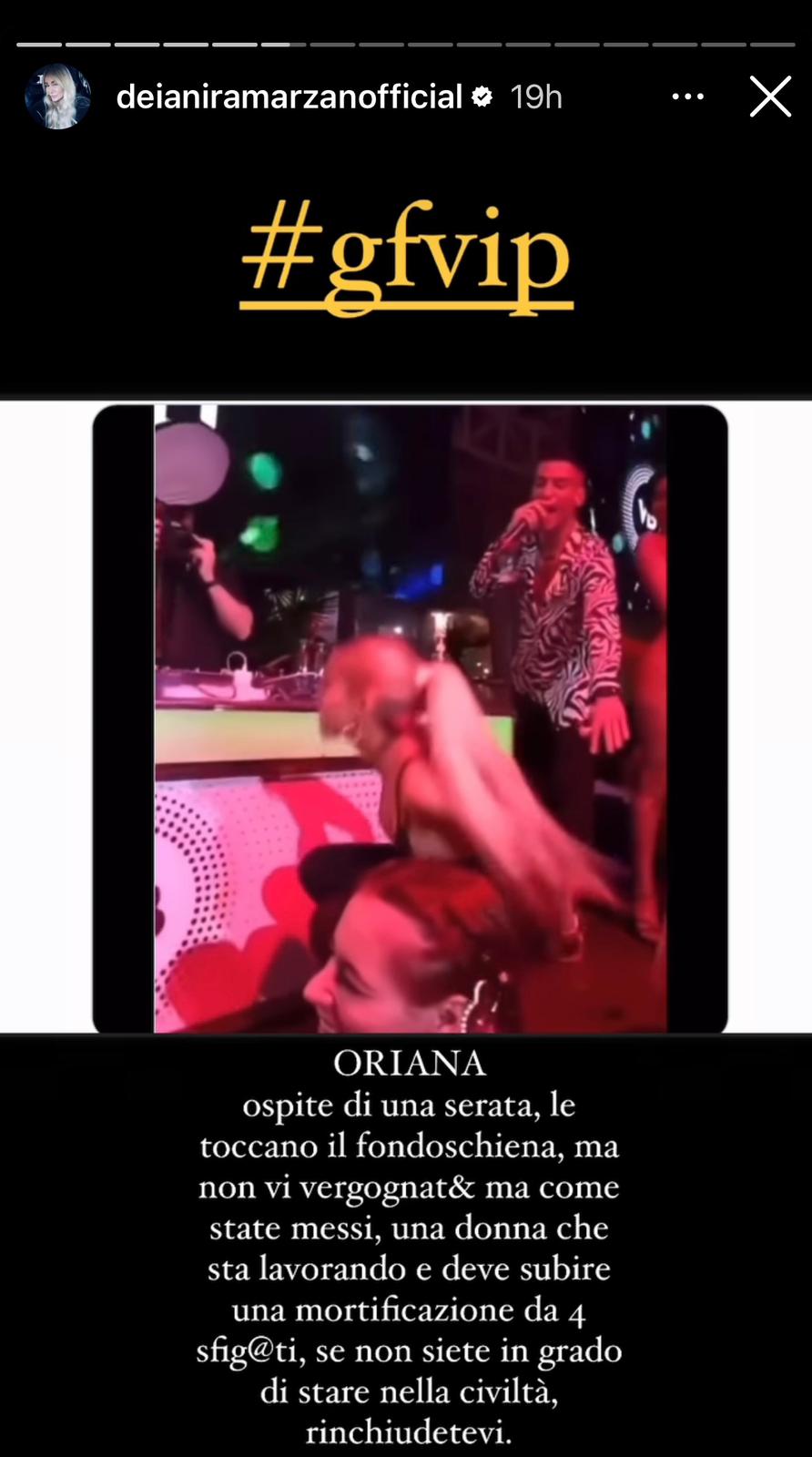 La nota Influencer ed esperta di Gossip Deianira Marzano ha denuciato nella giornata di ieri sul suo profilo Instagram un evento accaduto nello scorso Weekend. Oriana Marzoli avrebbe subito una molestia in discoteca da parte di un fan. Un video inviato da un follower alla Marzano riprende la Marzoli ospite ad una serata. La gieffina nel video era accovacciata sul palco mentre parlava con il dj, nel mentre qualcuno avrebbe approfittato della vicinanza per toccarle il fondoschiena. Nel video si vede la reazione della Marzoli, un sussulto di sorpresa e il suo alzarsi immediatamente dopo.