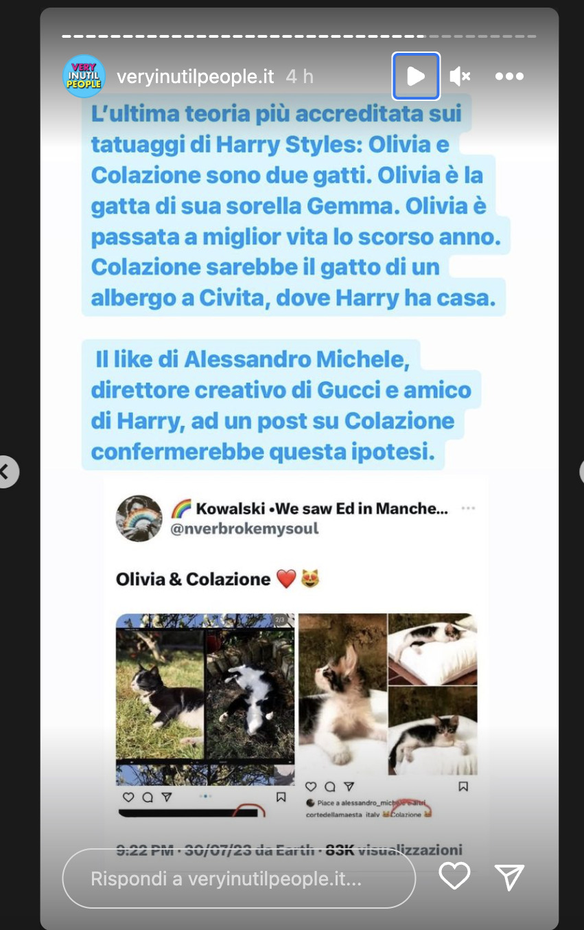 Harry Styles è stato fotografato sul Lago di Bolsena negli ultimi giorni e proprio in questi scatti hanno fatto bella mostra due tatuaggi molto curiosi, uno recitava il nome "Olivia" mentre l'altro la parola "Colazione". Subito in molti hanno associato il primo alla sua ex compagna, la regista Olivia Wilde, mentre per il secondo regnava il mistero dato che il termine è la traduzione dell'inglese "Breakfast". La verità secondo quanto emerge dai social sarebbe un'altra, infatti Harry Styles ama gli animali e si tratterebbe dei nomi di due gatti. Olivia è il nome del felino dell'amata sorella Gemma scomparso lo scorso anno, mentre Colazione è il nome di un gattino abitante di Civita di Bagnoregio dove secondo i rumors la stessa pop star britannica avrebbe acquistato un'esclusiva casa. La conferma su questa tesi arriverebbe proprio da un like di Alessandro Michele, ex direttore creativo di Gucci e amico della star. La cittadina laziale è uno dei luoghi con il paesaggio più suggestivo al mondo, tanto da aver ispirato "La Città Incantata" del maestro Hayao Miyazaki, ed ha conquistato il cuore dell'artista che ha deciso di catapultarsi nella Tuscia subito dopo le fatiche di Campovolo.