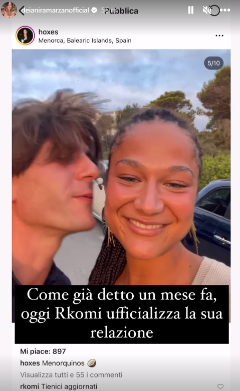 Nelle ultime ore però è arrivata l'ufficialità, con una storia su Instagram che mostra i due insieme in vacanza a Minorca. Nel video si vede la modella sorridere, poi spunta Rkomi che le stampa un bacio sulla guancia.