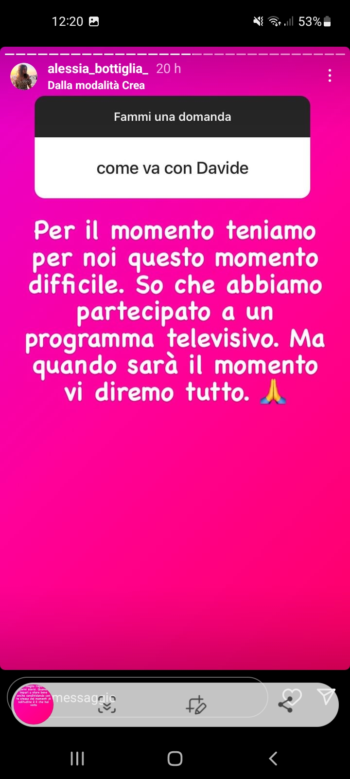 "Come va con Davide?" ha chiesto un fan e Alessia ha risposto: "Per il momento teniamo per noi questo periodo difficile. So che abbiamo partecipato a un programma televisivo, ma quando sarà il momento vi dirò tutto".