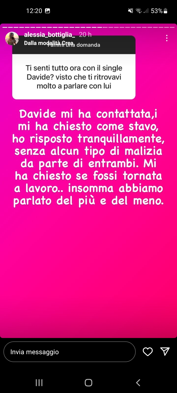 Alessia ha dedicato del tempo ai suoi follower per rispondere alle loro curiosità. Immancabile la domanda sullo stato della relazione con Davide Rosati, dopo che i due hanno dichiarato di essersi presi una pausa di riflessione, ma di essere in buoni rapporti.