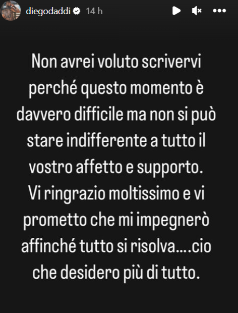 Tramite una serie di stories su Instagram, l’ex corteggiatore ha lasciato intendere che la decisione di allontanarsi sia partita proprio dalla moglie. Dal canto suo, Diego si dice pronto a fare il possibile per risolvere la situazione. A tal proposito, infatti, ha dichiarato ai fan: