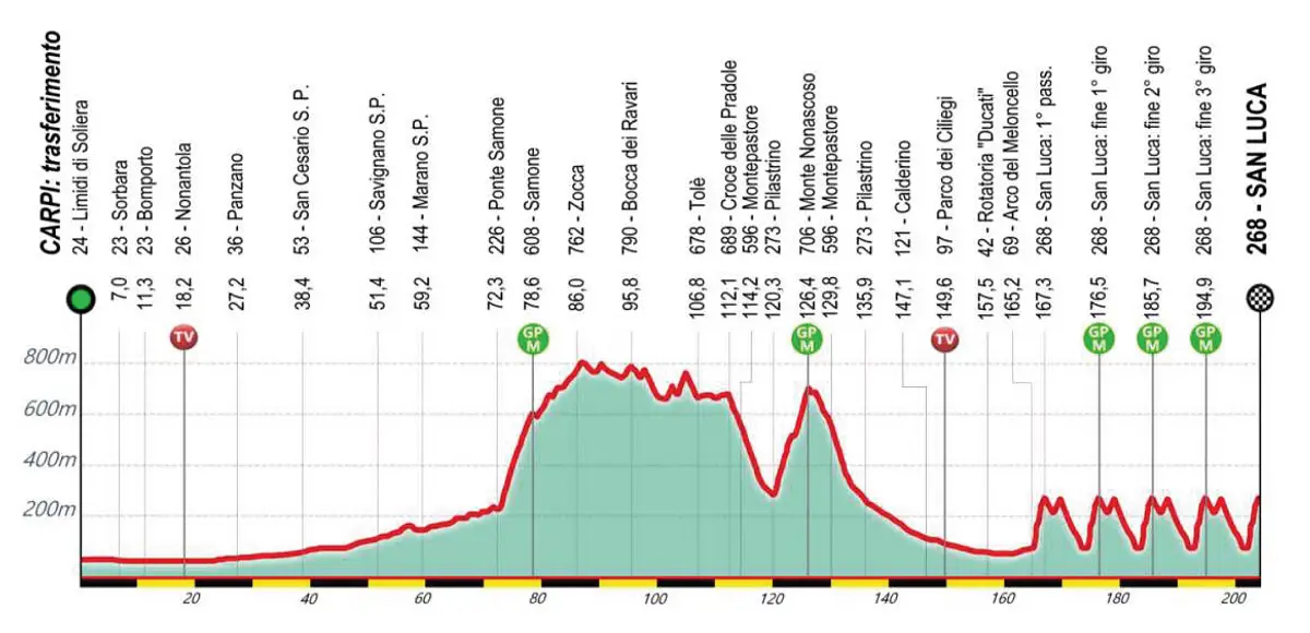 Il Giro dell'Emilia 2023 avrà la sua partenza a Limidi di Soliera (con trasferimento da Carpi), per poi terminare dopo 204 chilometri e 2.800 metri di dislivello totale. Ovviamente, all'interno del percorso sono previsti diversi colli che favoriscono una altimetria movimentata. Il primo GPM in programma è la salita di Samone (6 km al 6.7% di pendenza media), quindi occhio al GPM di Monte Nonascoso (6.1 km con pendenza del 7.1%) e il circuito con il San Luca che dovrà essere affrontato dai ciclisti per ben cinque volte. In questo senso, stiamo parlando di un muro di 2.2 km con pendenza media del 9%, ma con punte del 18%. Verosimilmente, sarà qui che si deciderà l'intera corsa.