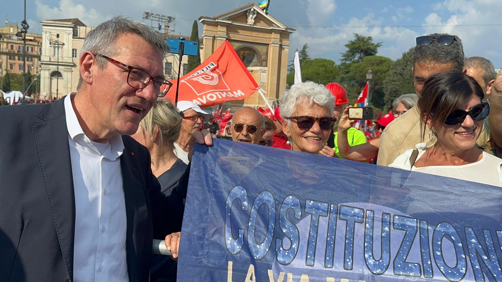 La diretta della manifestazione della Cgil a Roma, prevista per oggi, 7 ottobre 2023, e intitolata 'La via maestra, insieme per la Costituzione' vede il sindacato guidato da Maurizio Landini alla testa di sigle, partiti, associazioni, uniti dall'esigenza di rivendicare diritti che giudicano da troppo tempo ignorati o calpestati. Con loro anche gli esponenti delle opposizioni, con la delegazione del Partito Democratico guidata da Elly Schlein e il presidente del Movimento 5 Stelle Giuseppe Conte.