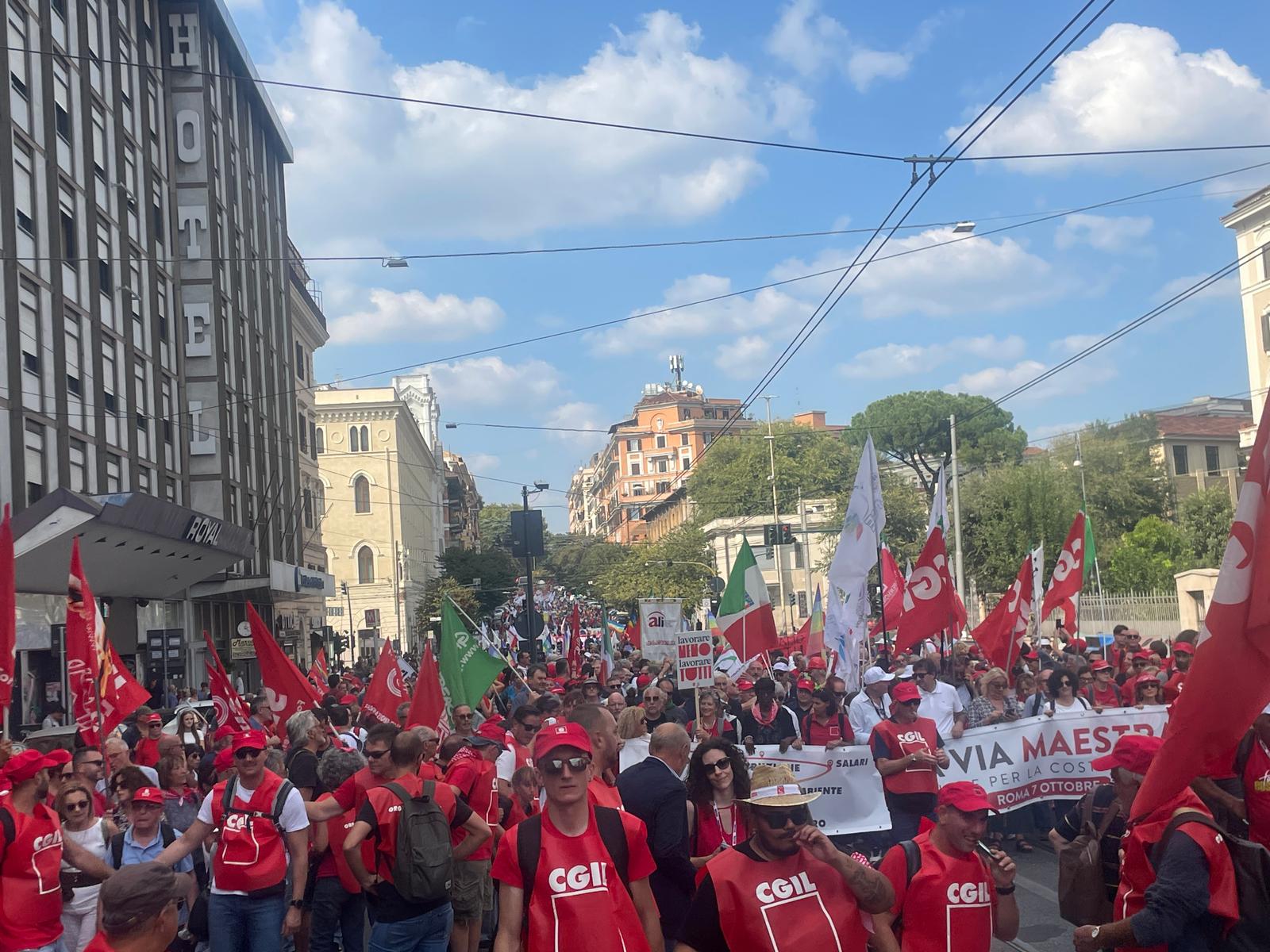 Sono in migliaia i cittadini, di ogni età, che oggi, 7 ottobre 2023, partecipano alla manifestazione nella Capitale fortemente voluta da Maurizio Landini e dal sindacato da lui presieduto, la Cgil. Una manifestazione intitolata simbolicamente 'La via maestra, insieme per la Costituzione', a indicare la strada programmatica da seguire, sancita dalla Carta Costituzionale e in opposizione con le politiche del governo presieduto da Giorgia Meloni, soprattutto sui temi dei diritti e del lavoro.