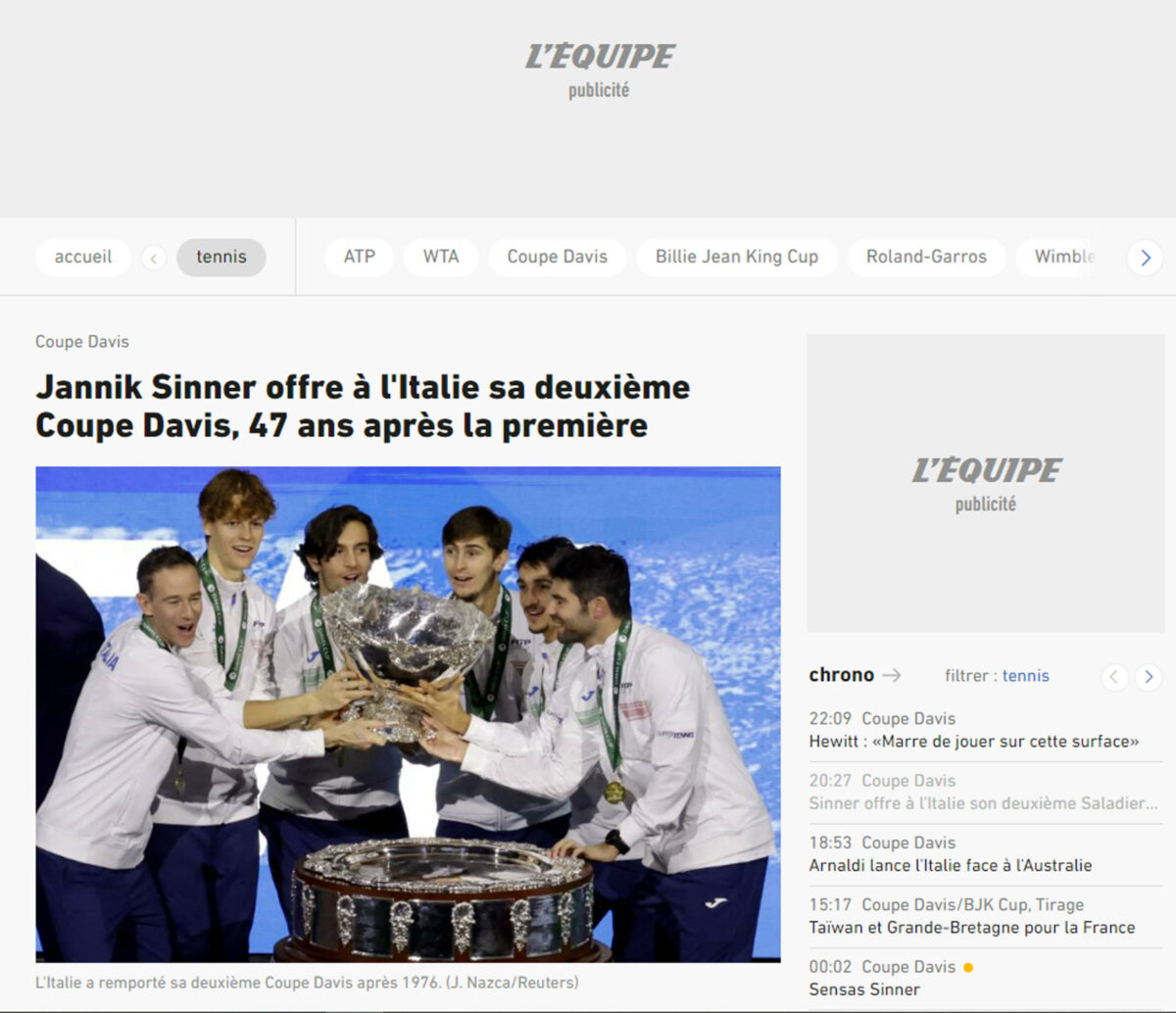 L'Italia vince la Coppa Davis: i titoli della rassegna stampa all'estero. - Un'impresa non indifferente, che ha attirato l'attenzione dell'Italia - ovviamente - ma soprattutto del mondo intero. L'Italia vince la Coppa Davis dopo 47 anni e sale sul tetto del mondo. Una vittoria probabilmente anche inaspettata, con il gruppo azzurro che ha acquisito consapevolezza nel corso del torneo anche grazie a un super Jannik Sinner, che si attesta sempre tra i primi al mondo e ha dimostrato di potersela giocare (e vincere) contro chiunque. L'aveva promesso dopo le ATP Finals: "Adesso la Davis". Con determinazione, concentrazione e mentalità da campione. La stessa che ha poi trasmesso al gruppo, con Arnaldi che ha vinto un match difficile in finale contro Popyrin e Sonego che ha giocato due doppi di alto livello proprio insieme a Sinner.