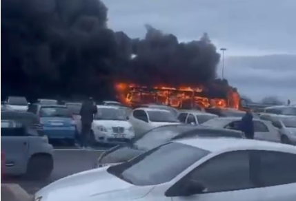 Le fiamme si sono levate alte lambendo un bus e tre automobili in sosta presso il capolinea della stazione di Anagnina, a Roma. La colonna di denso fumo nero è visibile da chilometri di distanza.