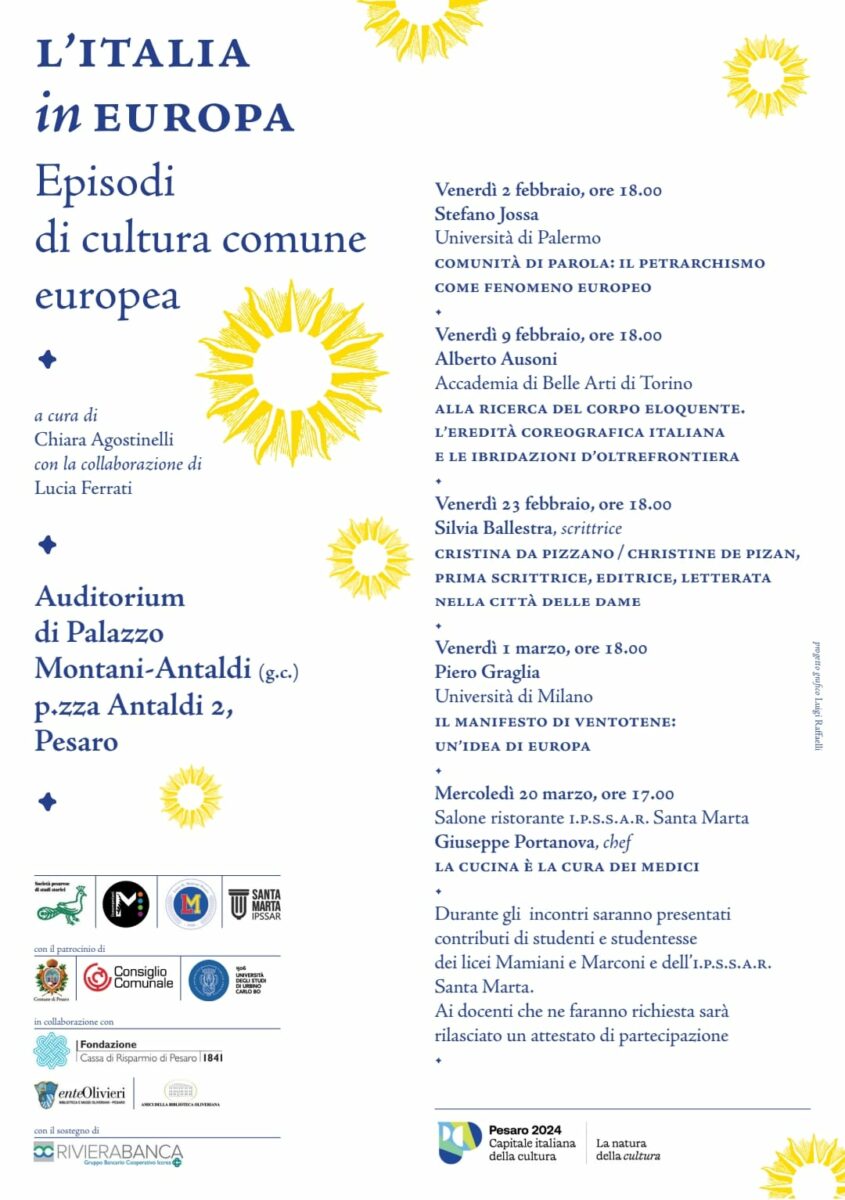 Nel quadro delle iniziative che vedranno quest’anno protagonista la città di Pesaro (ed il suo entroterra) il 2 febbraio prende avvio il ciclo di Seminari L’Italia in Europa. Episodi di cultura comune europea, organizzato dalla professoressa Chiara Agostinelli del Liceo Mamiani con la collaborazione di Lucia Ferrati, che, peraltro, il 20 gennaio ha letto il messaggio della senatrice a vita Liliana Segre.
