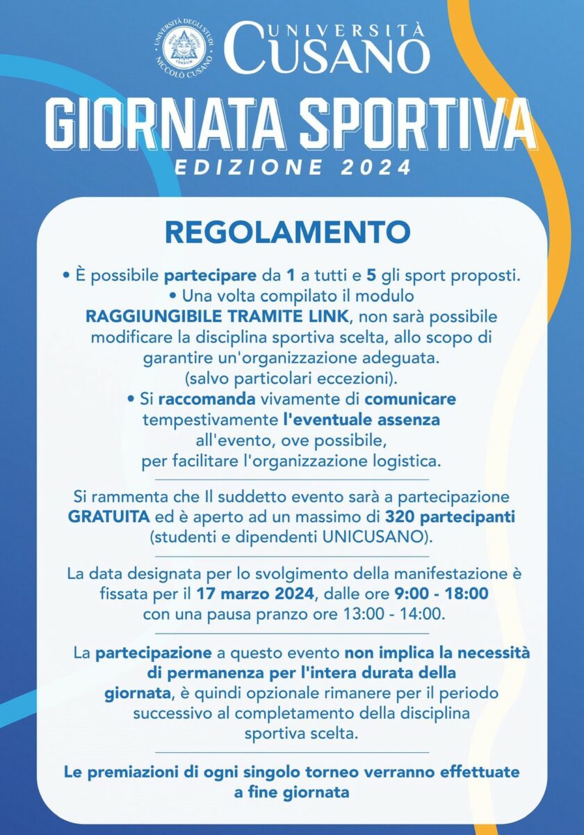 Il 17 marzo 2024 si terrà la seconda edizione della Giornata Sportiva Unicusano. L'iniziativa è aperta a tutti gli studenti e dipendenti dell'Università, con l'obiettivo di rafforzare ancor di più l'unione tutte le persone che vivono quotidianamente l'ambiente universitario.